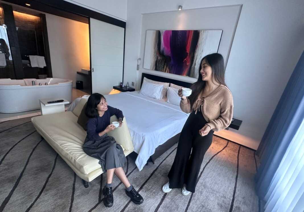 Selain bathtub, setiap kamar juga dilengkapi dengan meja kerja, mesin kopi, smart TV, dan pemandangan kota Surabaya yang indah.