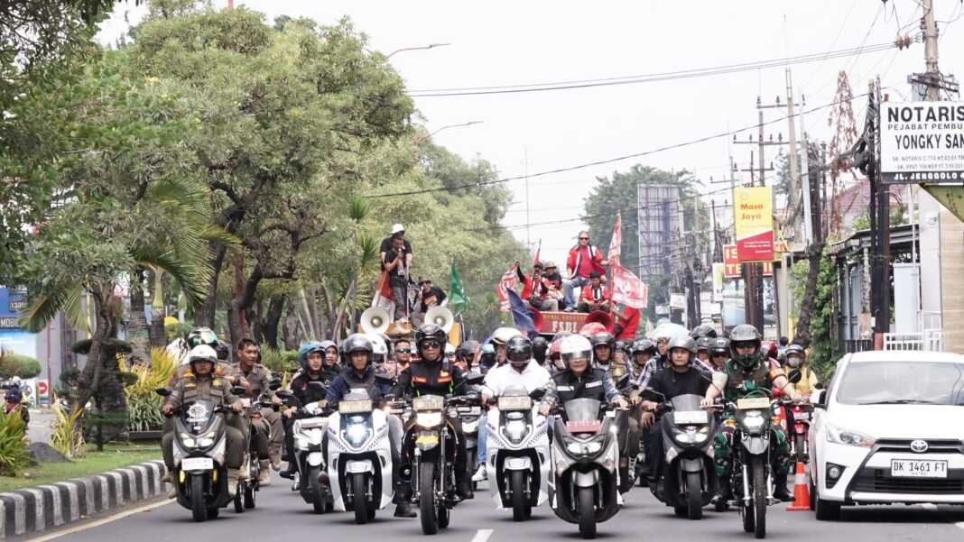 Bupati Subandi lalu mengantar ribuan buruh itu menuju Grahadi, Surabaya. Bersama Kapolresta Kombespol Christian Tobing dan Dandim Letkol Dedyk Wahyu Widodo, Bupati Subandi menemani rombongan buruh sampai ke Bundaran Waru. Naik sepeda motor. (MT)