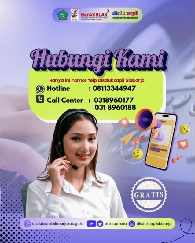 Semua pelayanan yang diberikan oleh Disdukcapil Kabupaten Sidoarjo bersifat gratis. Jika ada pihak yang menghubungi dan mengaku sebagai petugas Disdukcapil Kabupaten Sidoarjo agar segera melaporkan kepada Disdukcapil Kabupaten Sidoarjo atau pihak Desa/Kelurahan, pihak Kecamatan maupun Kepolisian setempat untuk ditindaklanjuti. (*)