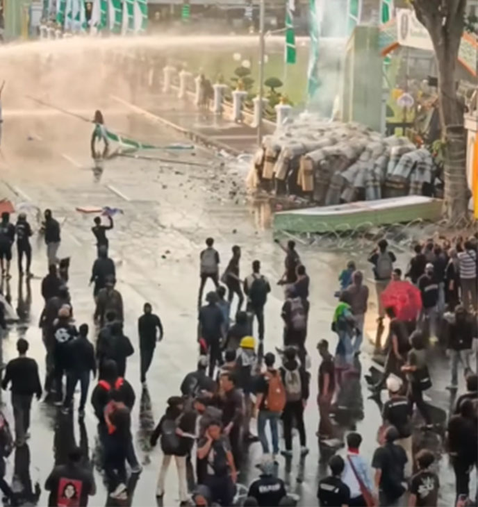 Massa tampak melempar batu, botol air mineral, petasan bahkan bom molotov ke arah polisi yang mengenakan pakaian lengkap anti huru hara dan tameng. Aksi lemparan ini dibalas polisi dengan semprotan water cannon.