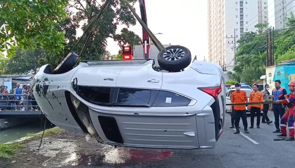 Mobil yang ringsek tampak terendam sebagian di sungai. Tim rescue Dinas Pemadam Kebakaran Kota Surabaya langsung diterjunkan ke lokasi setelah menerima laporan sekitar pukul 05.00 WIB. Proses evakuasi sempat alot karena petugas harus terlebih dahulu menguras air dan lumpur dari dalam mobil.