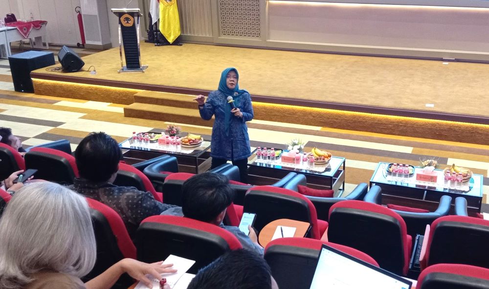 Prof. Yohana memaparkan tema pengabdian yang mencakup pendidikan, pertanian, kesehatan, peternakan, mitigasi bencana, dan seni budaya, memprioritaskan pangan, energi, dan kesehatan sesuai Rencana Induk Riset Nasional (RIRN) 2017–2045.