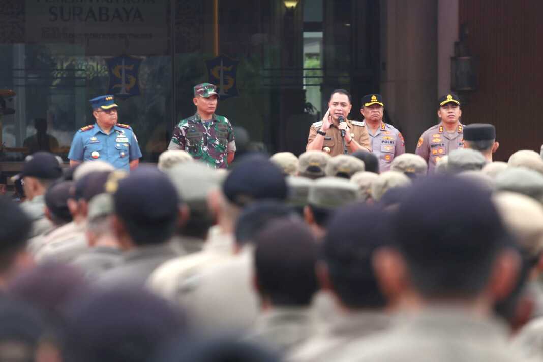 METROTODAY, SURABAYA – Pemerintah Kota (Pemkot) Surabaya bersama jajaran TNI/Polri kembali menggelar apel pagi pemberantasan juru parkir liar (jukir) dan aksi premanisme di Halaman Balai Kota, Selasa (10/6).