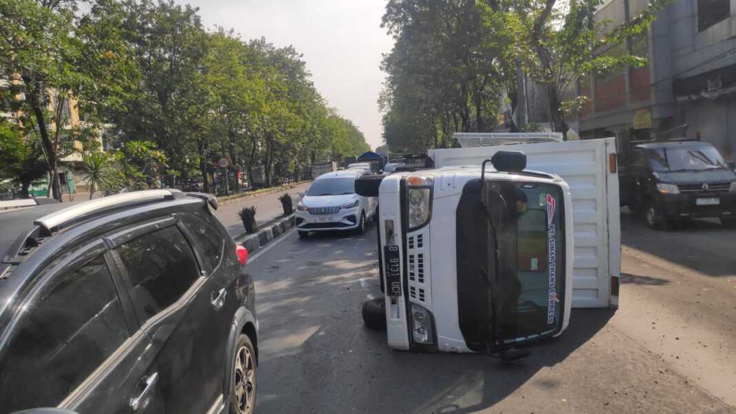 METROTODAY, SURABAYA – Kemacetan panjang melanda Jalan Raya Dupak, Surabaya, Kamis (10/7), setelah sebuah truk boks bernomor polisi B 9131 UCF terguling di lajur cepat menuju Stasiun Pasar Turi. Beruntung, insiden ini tidak menimbulkan korban jiwa.